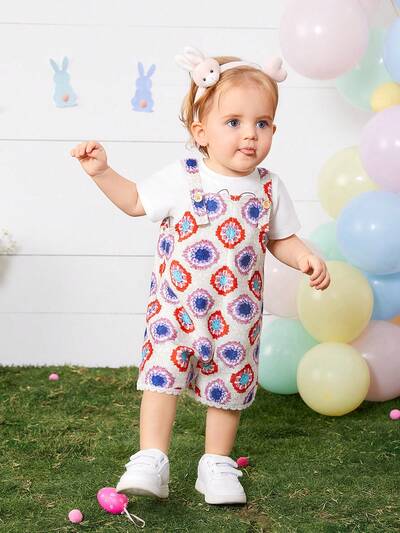 Baby Girls' Geometric Flower Pattern Sleeveless Romper With Suspenders-42%