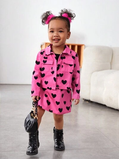 Baby Girl Casual Heart Pattern Long Sleeve Blouse With Elastic Waist Skirt Set