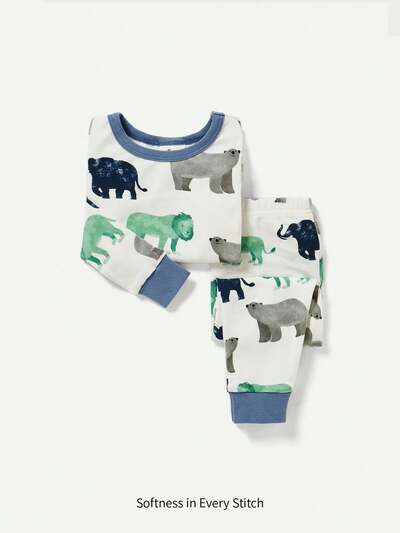 Baby Boy Snug Fit Pajama Set, Cartoon Animal Patterned Round-Neck Top And Pants Set-65%