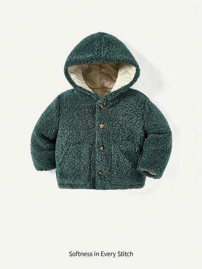 Baby Boy Solid Teddy Lined Button Front Hooded Coat-60%