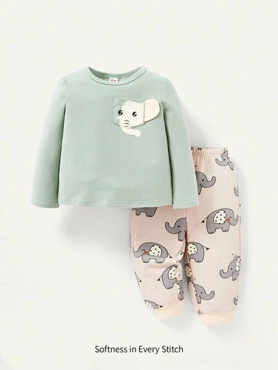 Baby Boy Elephant Patched Tee & Cartoon Graphic Sweatpants-50%