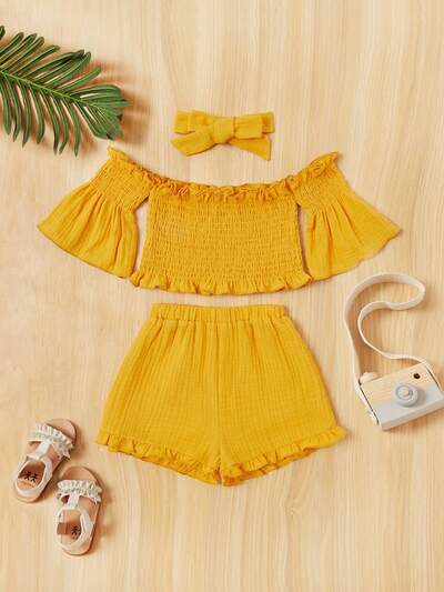 Baby Girl Adorable Holiday Plain Ruffled Off Shoulder Top & Shorts Set With Headband, 3pcs-41%