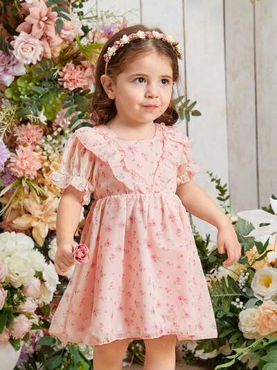 Baby Girl Cute Vacation Style Ruffle Trim Floral Pattern Spaghetti Strap Dress-56%