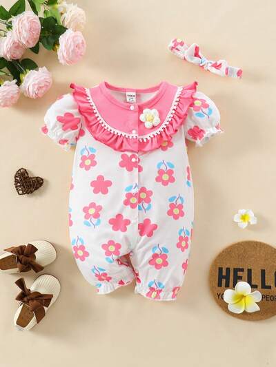 Baby Girl Summer Sweet Floral Print Romper With 3d Flower Decor & Bow Headband-43%