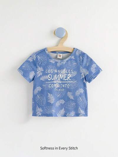 3pcs Baby Boy's Letter Print Round Neck T-Shirt, Palm Tree Pattern Shirt And Solid Color Shorts Set