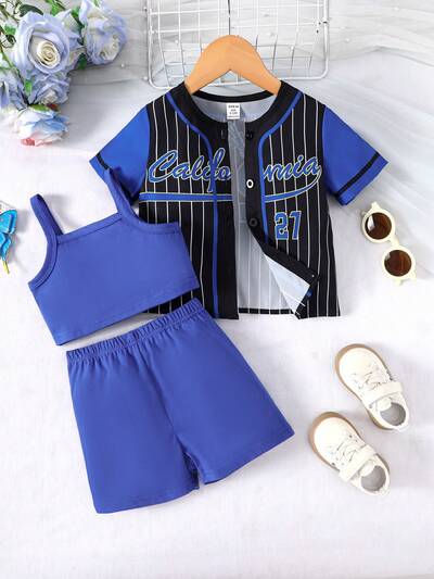 Baby Girl Striped Printed Patchwork Casual Short Sleeve Shirt And Solid Color Tank Top And Shorts Set