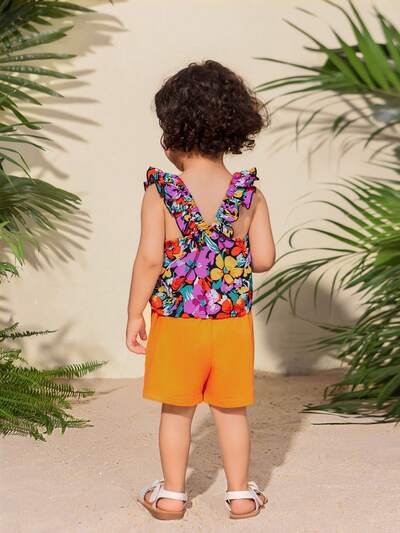 Baby Girl Summer Holiday Cute Floral Pattern Sleeveless Tank Top With Elastic Waist Belt Shorts Set