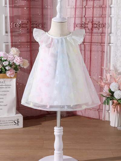 Baby Girl Colorful Star And Moon Pattern Ruffle Armhole Mesh Dress For Summer