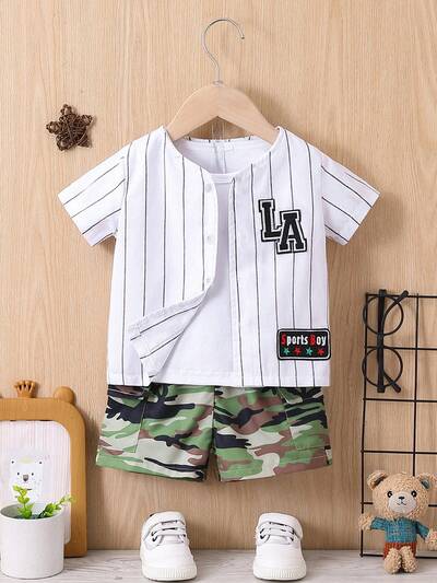 Baby Boy's Fashionable Striped Short Sleeve Shirt And Camouflage Shorts 2pcs Set For Summer-42%