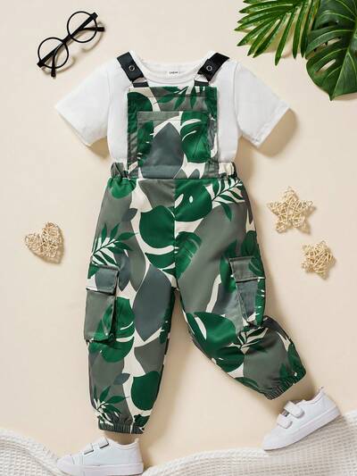 Baby Boys Spring Summer Casual Streetwear Tropical Rainforest Plant Pattern Workwear T-Shirt + Overalls Set-54%