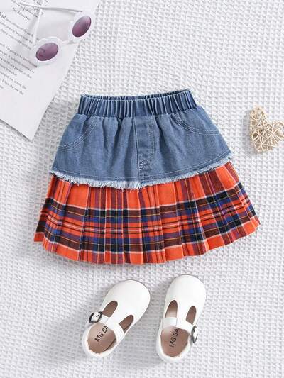 Baby Girl Frayed Denim And Plaid Pleated Skirt With Washed Design-43%