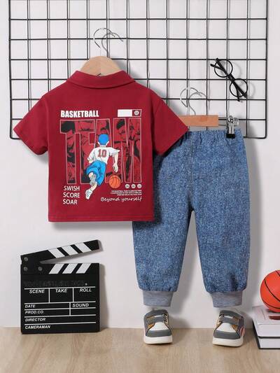 Baby Boy Unisex Baby Casual Polo Shirt Short Sleeve & Elastic Waist Jeans Style Long Pants Set-50%