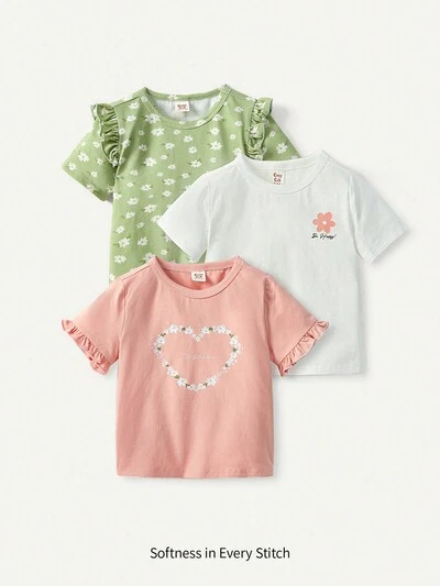 3pcs Baby Girls' Cartoon Pattern Round Neck Ruffle Sleeve Tops Set-42%