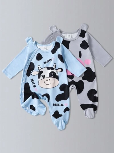 Baby Girl Cow Print Long Sleeve Footed Jumpsuit With Hat And Bib, 3pcs Set Home Outfit-42%