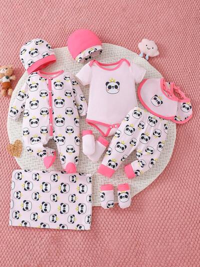 Baby Girl 10pcs Bear Ear Printed Jumpsuit, Long Pants, Hat, Bib, Blanket Gift Set-43%