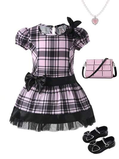 Baby Girls' Fashionable Retro Plaid Dress With Silk Ribbon, Bow Knot Decoration, Puff Sleeves, Low Waist And Fluffy Hem For Spring/Summer-43%
