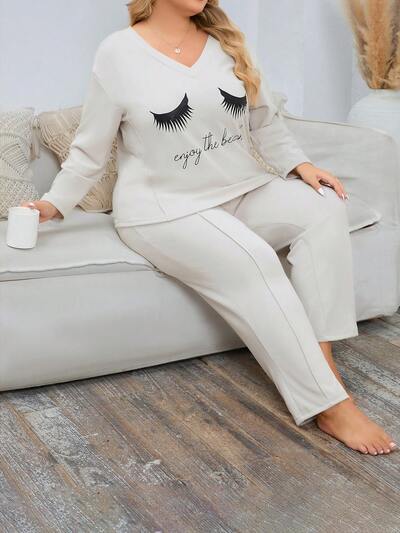 Plus Size Pattern Printed V-neck Top And Long Pants Pajama Set-24%