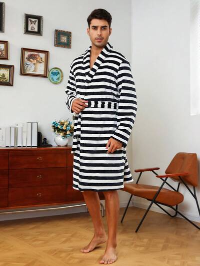 Men's Striped Shawl Collar Belted Robe