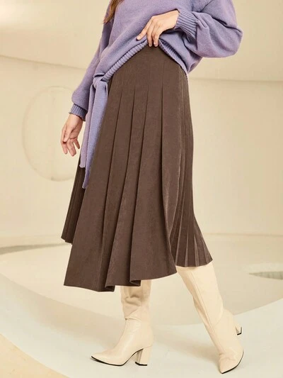 Solid Pleated Asymmetrical Hem Skirt-60%