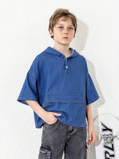 Tween Boy Solid Color Hooded Casual Denim Jacket With Pockets-60%