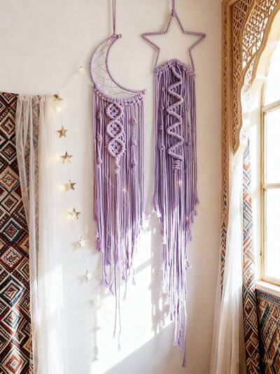 2pcs Handmade Crochet Lace Star Moon Dream Catcher Wall Hanging, Boho Style Home Decor Wall Art, Suitable For Home, Wedding, Living Room, Bedroom, Holiday Gift (Lights Not Included)
