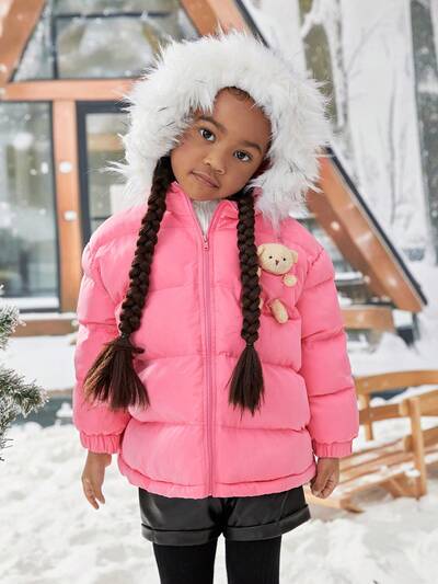 Young Girl Bear Decor Zip Up Fuzzy Trim Hooded Padded Coat-60%