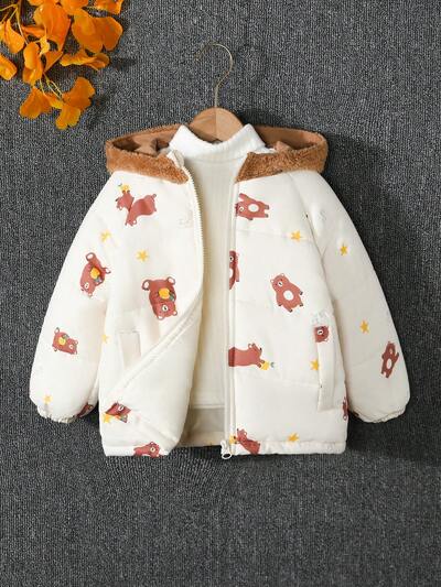 Young Boy Bear Print Thermal Lined Hooded Coat-60%
