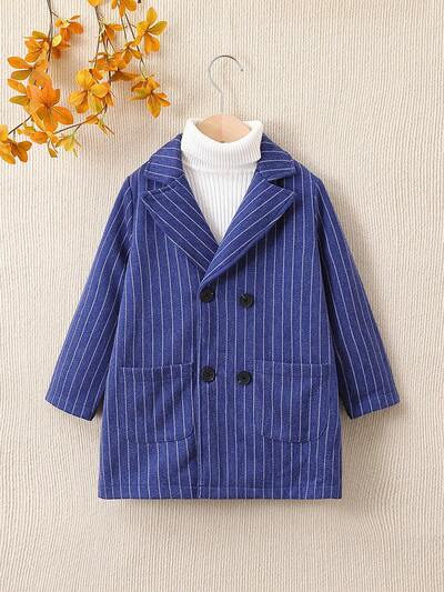 Young Boy 1pc Vertical Striped Dual Pocket Double Breasted Overcoat-60%