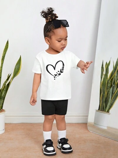 Baby Girl Casual Heart & Butterfly Pattern Short Sleeve T-Shirt With Elastic Waist Shorts Set-42%