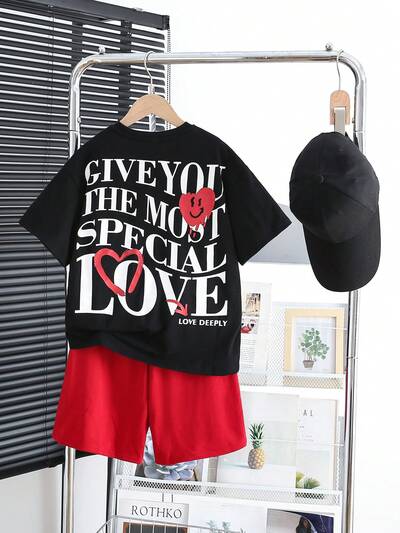 Tween Boys' Loose Fit Casual Round Neck Letter Print Short Sleeve T-Shirt And Shorts Set-43%