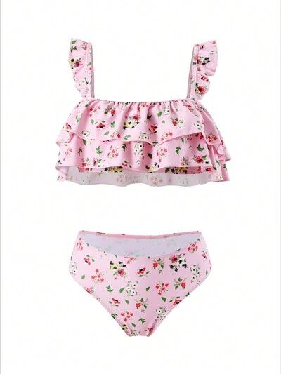 Random Floral Printed Multi Layer Ruffle Bikini Set Summer-50%