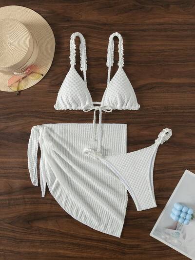 Women's Summer Beach Solid Color Frill Bandeau Bikini Set With Detachable Straps, Matched With Cover Up Skirt-32%