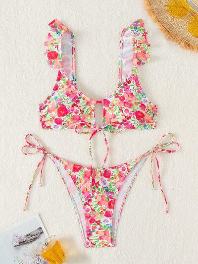 Women's Flower Print Two-Piece Bikini Set With And Ruffle Hem Detailing,Summer Beach-32%