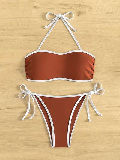 Women Summer Plain Bandeau Bikini Set With Back Tied Swimwear Top And Separated Bottom, Suitable For Beach And Pool,Summer Beach-32%