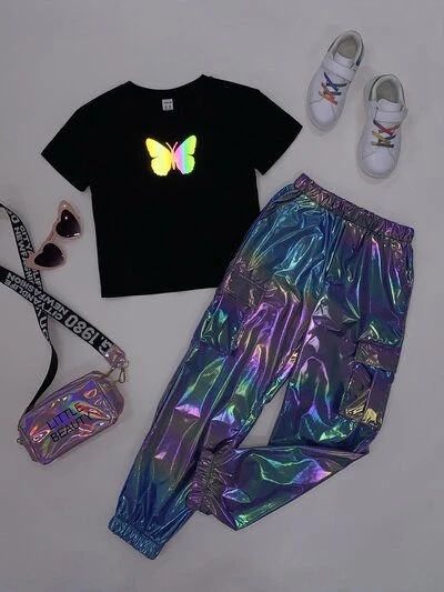 Tween Girl 1pc Butterfly Print Reflective Tee & Pants Set-41%