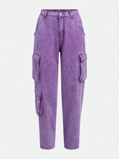 Teenage Girls Y2K Street Style Utility Pocket Heavy Washed Purple High Waisted Wide Leg Jeans-44%