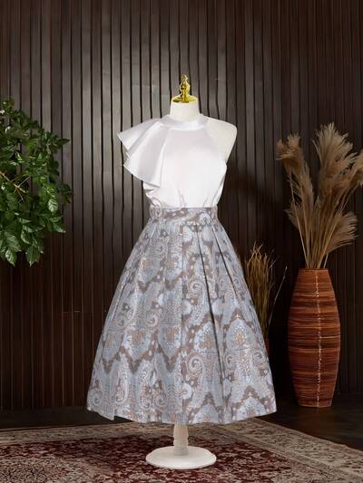 Tween Girl Summer Vintage Printed Stand Collar Sleeveless Top With Ruffled Hem, And Skirt Set-67%