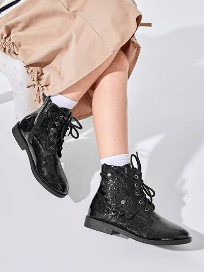 New Material Glitter Embroidered Wing Design Short Boots For Girls, Combat Style Flat Comfortable Breathable Boots With Shoelaces