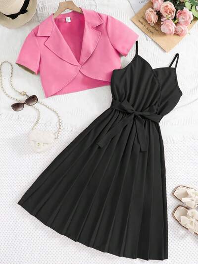 Teen Girl Short Sleeve Top And Spaghetti Strap Dress 2pcs Set, Suitable For Summer