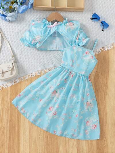 Young Girl 2pcs/Set Warm Holiday Clothing, Lace-Trimmed Floral Jacket And Spaghetti Strap Dress For Summer
