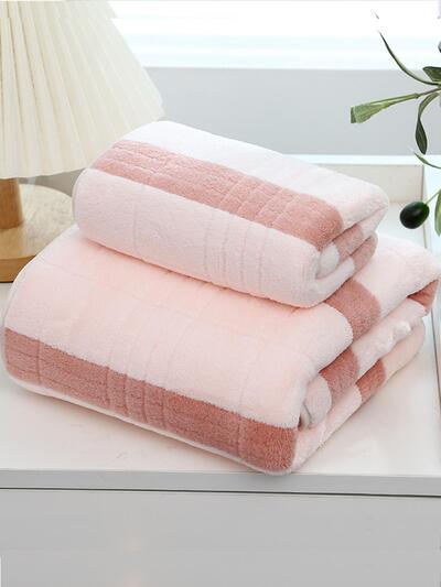 2pcs/Set Coral Fleece Family & Couples Striped Plaid Soft Absorbent 35*75cm Hand Towel + 70*140cm Bath Towel