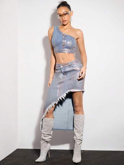 Metallic Elastic Sexy One Shoulder Denim Top For Women&Concert Outfits&Music Festival-25%