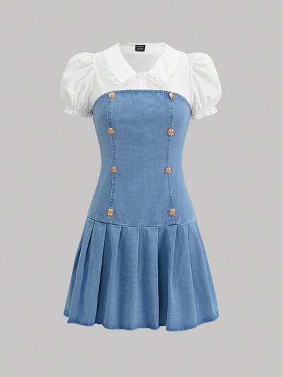 Women's Colorblock Puff Sleeve Denim Dress-63%