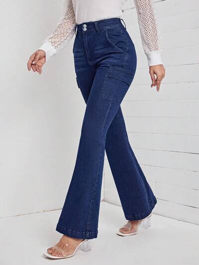 High Waist Flap Pocket Flare Leg Jeans-65%