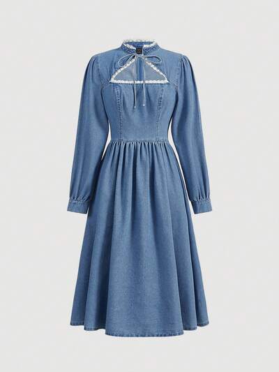 Contrast Lace Cut Out Front Denim Dress-65%
