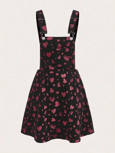 Heart Print Overall Denim Dress-65%