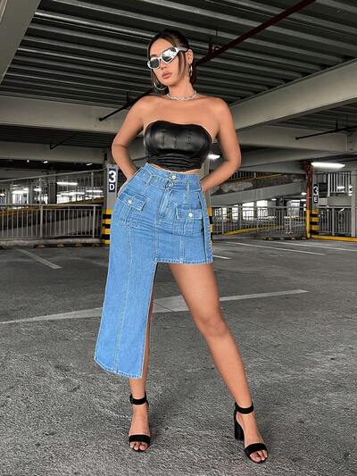 Flap Pocket Asymmetrical Hem Denim Skirt-65%