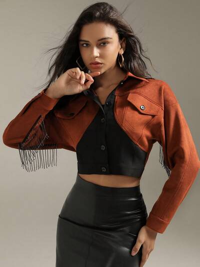 Women's Color Blocking Fringe Cropped Jacket-65%