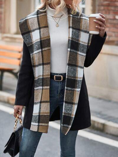 Plaid Print Shawl Collar Open Front Overcoat-60%
