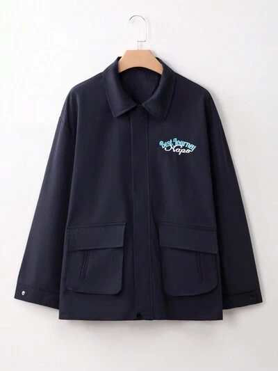 Letter Embroidery Flap Pocket Drop Shoulder Coat Fall Cloth For Women-60%